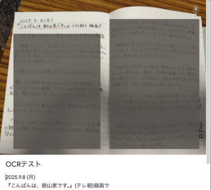 右はアンドロイドスマホでGoogle Keepを開き、A5ノートの見開きを撮影して「画像のテキストを抽出」を押したもの。数秒で全文字がテキスト化される。(この下にズラッとテキストが続いている。)
