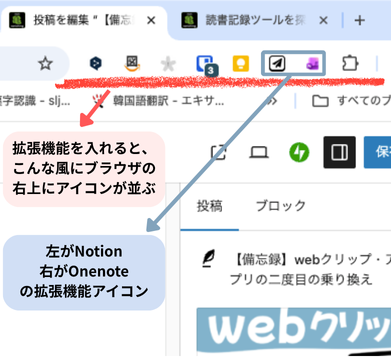 右図の拡張機能のアイコンの説明に「左がNotion」とうっかり書いてしまったけれど、正しくは左は「Save to Notion」という拡張機能のアイコン。Notion純正のクリッパーもあるんだけれど、それより評判の良かったこちらを採用した。